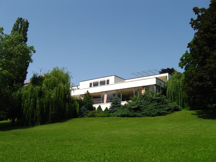 В туристических путеводителях по Чехии вы никогда не увидите эту виллу  с уличного  фасада, он блекло-серый, унылый, совсем непримечательный. Именно поэтому в её поисках мы дважды проходили мимо, прежде чем обнаружили вход. Помогла вывеска: «Вилла Тугентхат. Просмотр только по предварительной записи с экскурсоводом. Памятник мирового культурного наследия UNESCO. Охраняется государством etc...» За что этот объект удостоился чести представлять функционалистскую архитектуру Центральной Европы 20-30 гг., совершенно не понятно. До тех пор, пока не попадаешь внутрь. Здесь всё необычно, но знакомо, чувство дежавю берёт за горло и ласково сопровождает по дому, - сооружение-то породило множество реплик и подражаний. Комфорт и сдержанное богатство, ни грамма ничего лишнего. Белый трёхэтажный дом, где средний этаж не имеет стены – приоткрытый моллюск с жемчужиной внутри. В ужасном состоянии, после многократных переделок-ремонтов, замечу. Фриц Тугендхат и  Грета Вайс (урожд. Löw Beer) вышли из семей богатых еврейских текстильных фабрикатов. Построить собственный дом они задумали в 1927 г. накануне своей свадьбы. Участок выделил к свадьбе отец Греты – подарок, на мой взгляд, сомнительной ценности, - это был кусок сада, примыкавшего к дому семьи Löw Beer. Одно достоинство – прекрасный юго-западный вид на весь город Брно. В остальном ни уму, ни сердцу: растянутый участок на окраине города, на крутом обрыве. Здесь можно было прилепить разве что гнездо. Тем не менее, пара приняла решение построить свою семейную резиденцию…